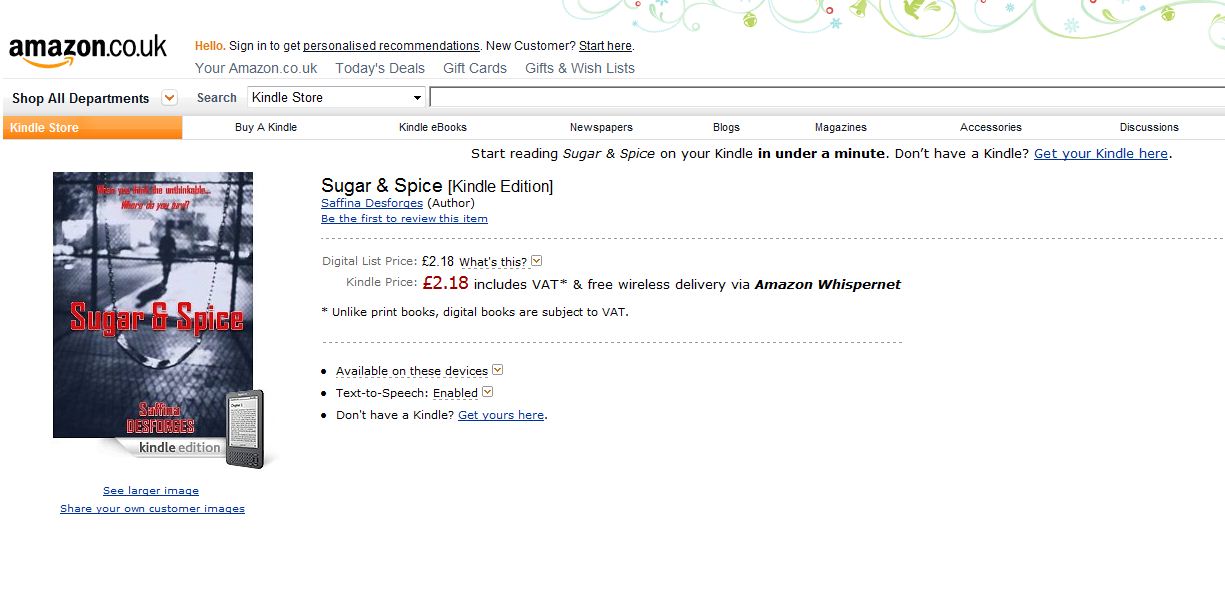 I am pleased to announce that Sugar & Spice ‘went live’ on Amazon Kindle ebooks this morning and is available for download.