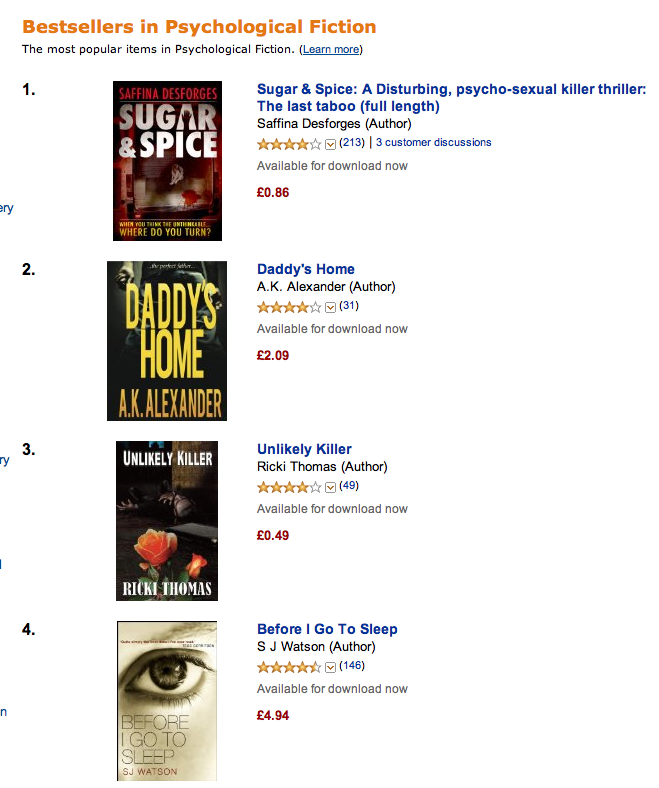 The Amazon charts are crazy at the moment with trad pub’d works on sale, but we seem to be holding steady in the Top 100 and ‘Sugar & Spice‘ is still selling thousands a month, so we are very happy to still be the only ‘truly indie’ book that reached #2 in the charts and has sold the most copies of a debut novel.